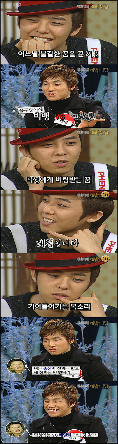 이에대해 대성은 "양현석 사장님까지 질투를 하신다"며 "사장님이 윤종신 선배와 친구인데 내게 '종신이 전화는 받고 내 전화는 안받더라'고 말하기도 한다"고 밝히기도 했다. 여기에 더해 태양은 "사장님은 '대성이는 YG 패밀리 아니고 그냥 '패밀리' 거 같다'며 서운함을 표현 한다"고 덧붙였다.